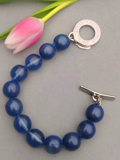 90 lei,sticla reciclata, metal argintiu, semnată, potrivită oricărei încheieturi de max 18 cm, bile aprox 2 cm diam, impecabila, suuperba.
