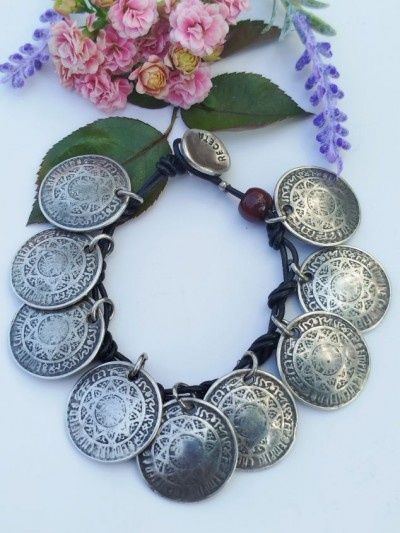 130 lei,metal masiv argintat in baie de argint,piele,. potrivită oricărei încheieturi de max 19 cm, diam. monede 2.5 cm,impecabila, semnată, superbă.