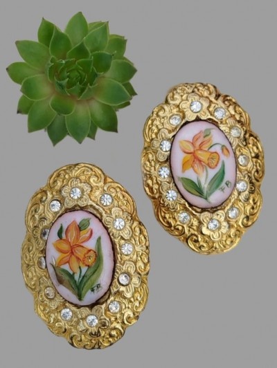 100 lei,masivi, auriți ,cristale, email pictat manual, semnat, clips,3.2/4.5 cm,impecabili, absolut minunați