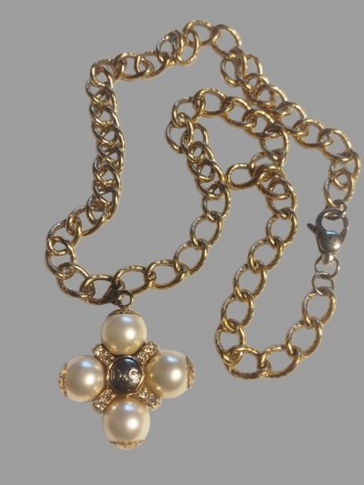 220 lei,otel.placat cu aur, perle si cristale, semnat atat penlant cat si pe centru, lungime 55 cm, centru 3.7 cm,impecabil, suuuperbm