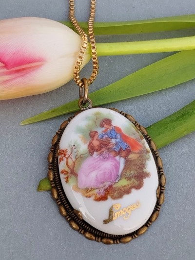 100 lei, lanț aurit lungime 47 cm pandantiv porțelan de Limoges, semnat 3/4.2 cm, suuuperb.