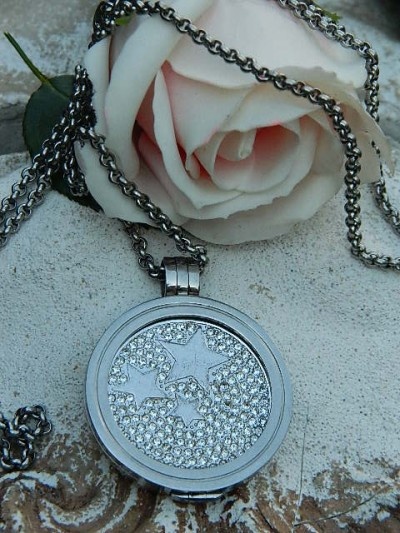 190 lei, otel ,masiv, cristale, discul se poate schimba, lant 90 cm, pandant dioam 4.3 cm, conditie excelenta, usor zgariat pe spate , se poate polisa, suuuperb