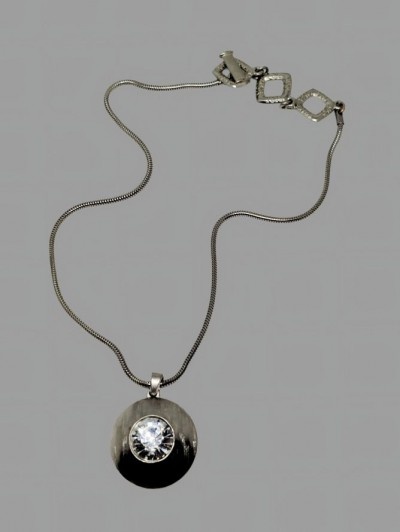 560 lei,masiv placat cu aur alb, cristal superb, semnat atat pe lant cacat si pe piesa centrala, inchidere intre 38 si 42 cm, centru diam 2.6 cm,impecabil, suuperb.
